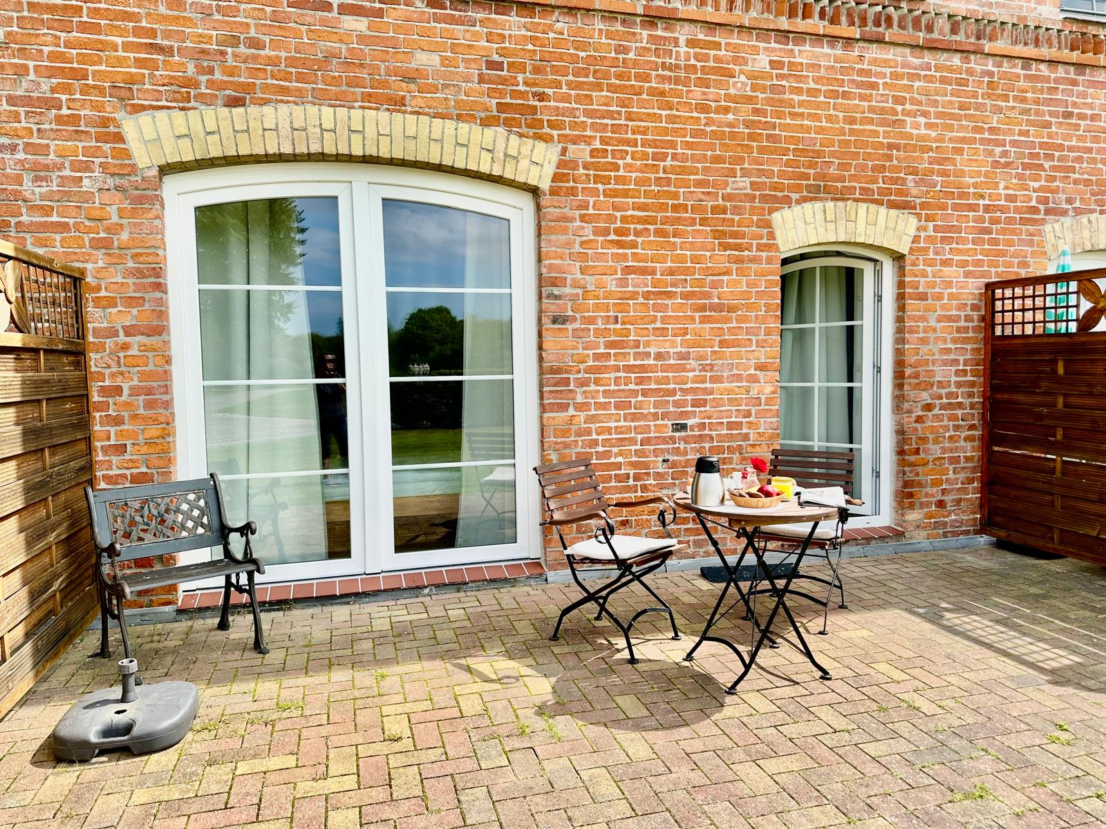 Bodentiefe Fenster geben Ihnen einen direkten Zugang zur Terrasse mit herrlichem weitläufigen Ausblick in den Park. Hier finden Sie gepflegte Gartenmöbel bzw. einen Strandkorb.